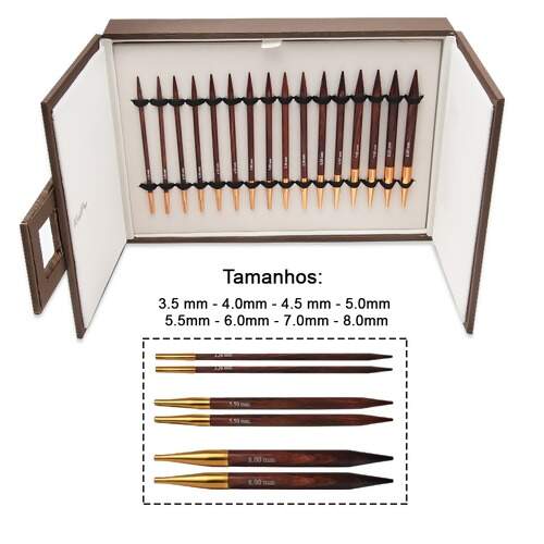 Agulhas nos Tamanhos: 3,5mm - 4,0mm - 4,5mm - 5,0mm - 5,5mm - 6,0mm - 7,0mm - 8,0mm Comprimento das agulhas: 11,5 cm.