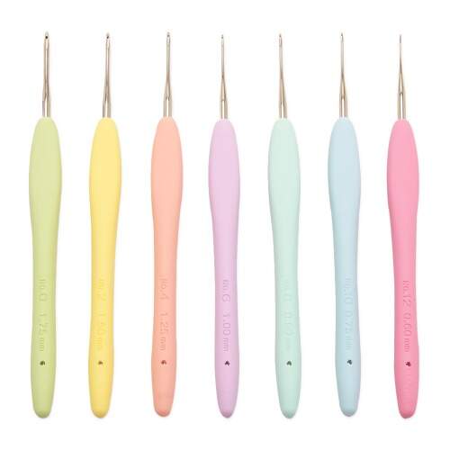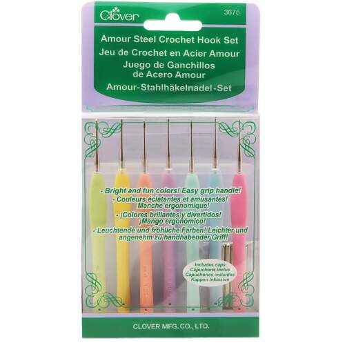 Amour Steel Crochet Hooks são codificados por cores suaves de acordo com seus tamanhos. Cabo de borracha de elastômero, projetadas para manipulação fácil e confortável.