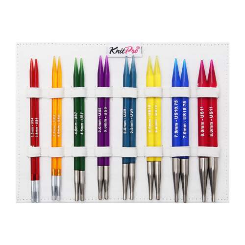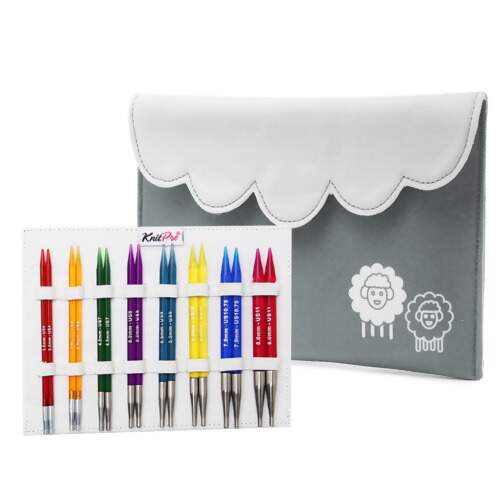Este é o conjunto perfeito de agulhas intercambiáveis para o tricotador que gosta da cor brilhante e da superfície lisa de uma agulha de acrílico altamente polida. Este conjunto contém 8 pares de pontas de agulha intercambiáveis, além de 4 cabos giratórios de aço inoxidável revestidos de nylon preto (60, 80(2), 100cm) e acessórios. Tudo vem embalado em um lindo estojo de tecido cinza que pode ser usado de mais de uma maneira.