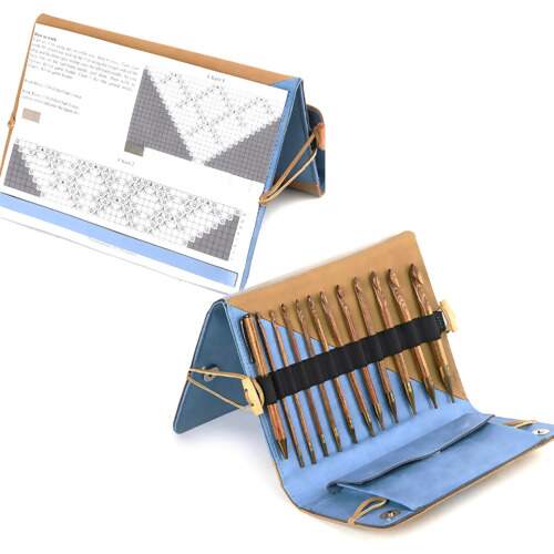 Luxuoso estojo de couro vegano e material de acabamento bege. O estojo multiuso que também funciona como porta-tabelas. Inclui 11 agulhas de crochê em tamanhos diferentes e quatro cabos em uma variedade de comprimentos para todos os tipos de projetos junto com conectores de cab ...veja mais