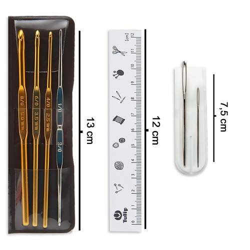 - 3 Agulhas de alumínio para crochê ponta única: 2.5mm, 3.5mm, 5.0mm;