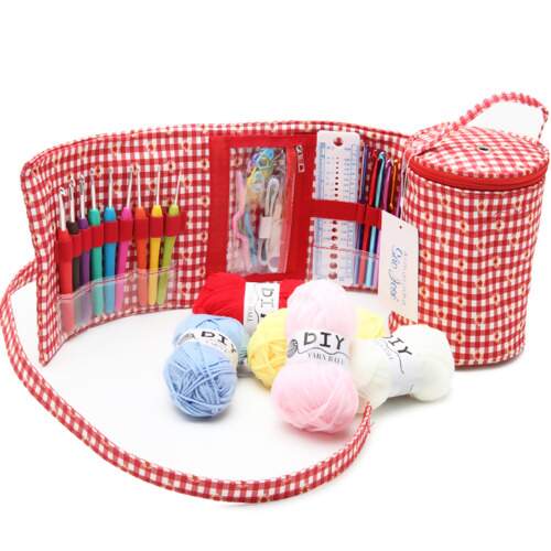 É um conjunto que inclui agulhas de crochê, fios e acessórios úteis, e mantém tudo organizado em um charmoso estojo junto com a bolsa de punho. Ideal para entusiastas do crochê, este kit oferece praticidade e estilo, permitindo que os adeptos dessa arte criem belas peças com facilidade.