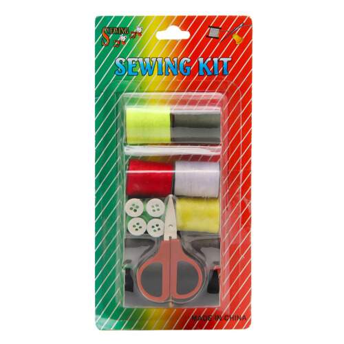Contém: 10 retroses de Linha para costura, 4 botões Branco de Plástico 4 Furos, 1 Tesourinha cabo plástico.