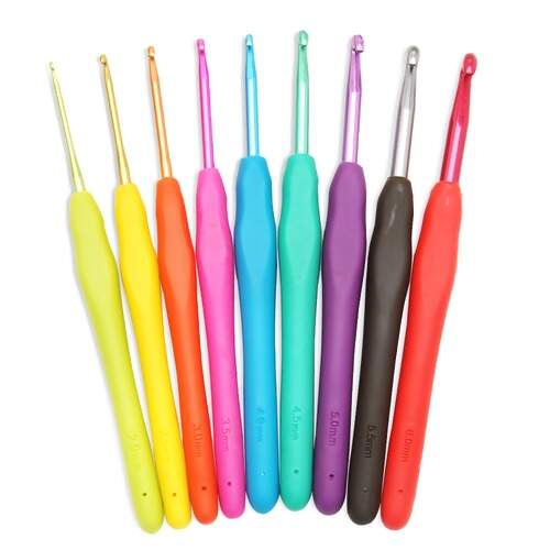 - 8 Agulhas de Crochê com Cabo Emborrachado de 8 tamanhos diferentes (2,0mm, 2,5mm, 3,0mm, 3,5mm, 4,0mm, 4,5mm, 5,0mm, 5,5mm, 6,0mm)