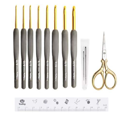 As Agulhas de Crochê Tulip Etimo Gold, da renomada fabricante japonesa Tulip, oferecem qualidade premium para seus trabalhos. Possuem cabo emborrachado macio que se ajusta perfeitamente às mãos, além de ponta em metal com acabamento suave, que garante menor atrito, mais precisão e conforto. São ideais para quem busca produtividade, leveza e menos cansaço durante longas horas de crochê.