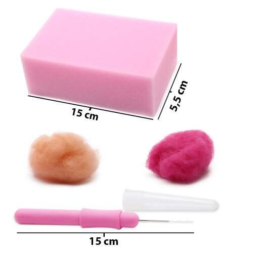 Este kit contém: - 01 agulha para feltragem, 01 bloco de espuma para perfuração nas medidas 10x15x5,5 cm, 02 lãs nas cores pink e pêssego, 01 Receita
