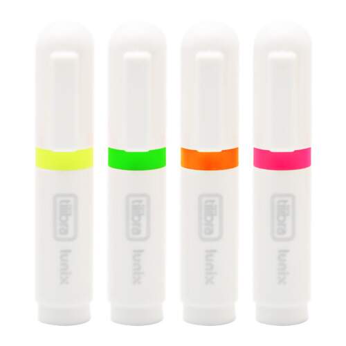 O Marca-Texto Mini Lunix possui ponta chanfrada que pode variar de 1 a 4,5 mm, de acordo com a inclinação. O produto está disponível em embalagem com cinco unidades nas cores neon amarela, rosa, verde, laranja e roxa.