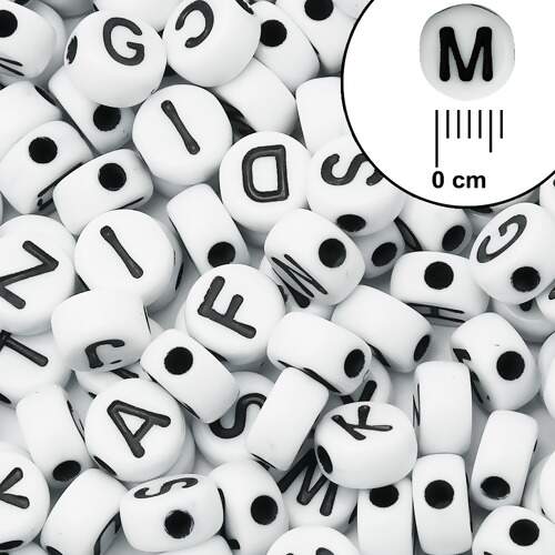 Descrição Miçanga de Letras Redonda 06mm Branca com Preta com 48g