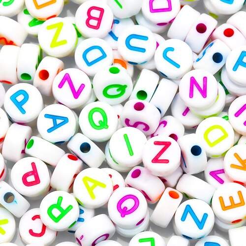 Descrição Miçanga de Letras Redonda 06mm Colorida Fundo Branco 48g