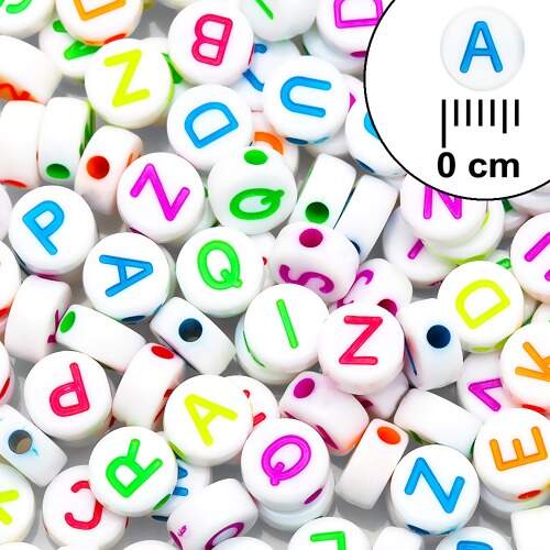 Complete seus acessórios e artesanatos com a Miçanga de Letras Redonda 06mm Colorida Fundo Branco 48g. O Fundo é branco e as letras gravadas são coloridas, essas miçangas são ideais para personalizar pulseiras, colares, chaveiros e outros projetos criativos. Versáteis e práticas, ajudam a compor nomes, iniciais ou mensagens, deixando suas criações ainda mais exclusivas e divertidas.