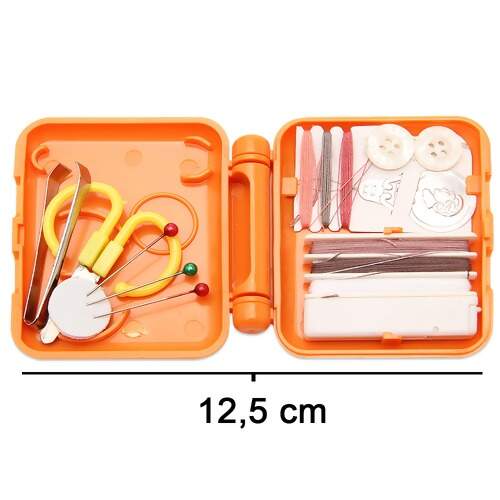 Contém: 3 agulhas de mão, 6 rolinhos de linha para costura (cores diferentes), 2 botões, 1 passador de linha, 3 alfinetes, 1 mini tesoura e 1 pinça.
