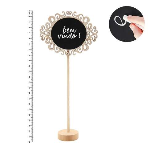 Descrição Mini Lousa Redonda para Festa de MDF com Base Wei 10x24cm