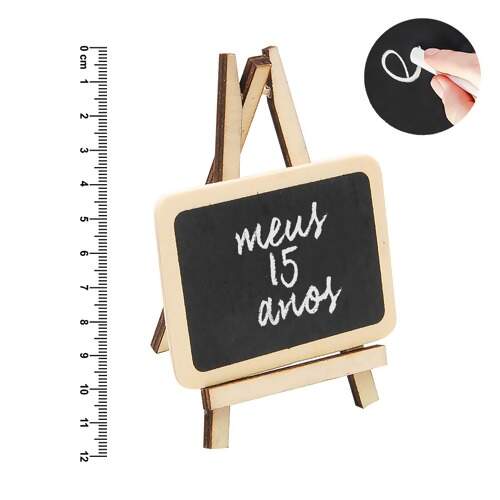 Detalhe Mini Lousa Retangular para Festa de MDF com Cavalete Wei 8x12cm