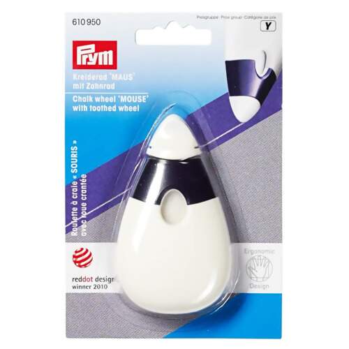A roda de giz "Mouse" da linha prym.ergonomics é perfeita para marcações à mão livre em diversos tipos de tecido. Sua espessura fina na parte superior permite traços precisos e visíveis, que podem ser facilmente removidos ao escovar ou lavar após a costura. O nível do giz no cartucho é visível através de uma janela prática, e uma tampa aderente garante o fechamento seguro da roda do giz.