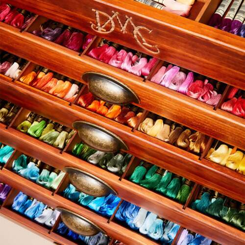 O melhor acessório para os entusiastas do bordado! Você se sentirá inspirado olhando para os fios Mouliné DMC lindamente dispostos em nosso móvel de madeira vintage.