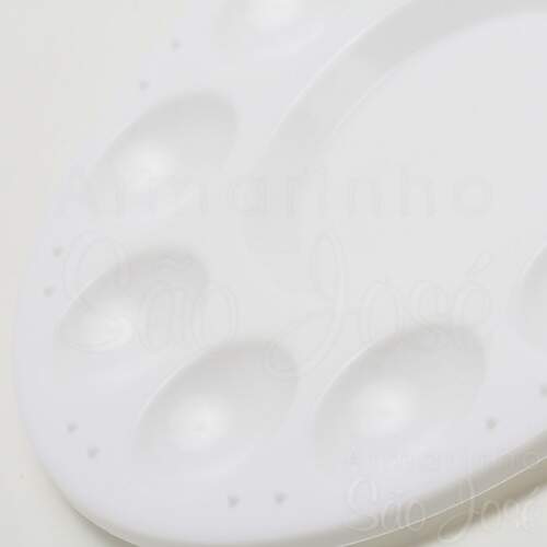 Paleta plástica para aquarela medindo 17cm x 23cm ideal para trabalhos onde diferentes cores são necessárias. Possue 7 cavidades. Resistente a solventes, pode ser usada com qualquer tipo de tinta.