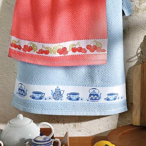 Pano de copa felpudo para bordar, encorpado e de ótima absorção, com barra decorada em jacquard.