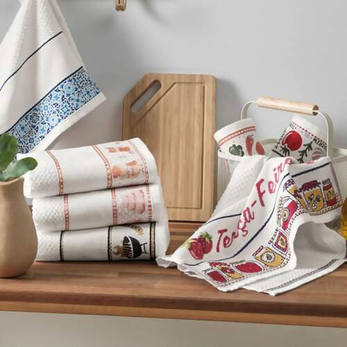 O Pano de Copa Para Bordar Messina apresenta diferentes temas bordados em sua barra e conta com uma faixa de etamine para você personalizar do seu jeito, seja com bordado à máquina ou manual. Seu corpo, com textura pipoca, oferece ótima absorção, tornando a peça não só charmosa, mas também funcional. Sua barra mede 7,5 cm de altura. O pano possui 46 cm x 65 cm e gramatura de 340 g/m².
