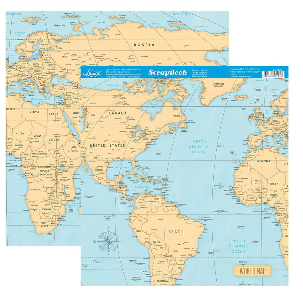 Papel p/Scrapbook Decor Duplo Litoarte Ref.SD 30,5 x 30,5cm Modelo II 0839- Mapa Mundi FL