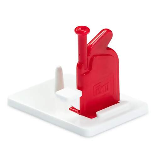 ideal para quem costura frequentemente à mão. Esta pequena máquina de enfiar, feita de plástico vermelho, está firmemente fixada em uma base branca, que também possui um fuso para acomodar um carretel. Na parte traseira, há uma pequena lâmina para cortar a linha no comprimento desejado. Basta inserir a agulha de costura manual com o olho no suporte e posicionar a linha na ranhura na parte superior; ao pressionar o botão branco, a linha será enfiada automaticamente.