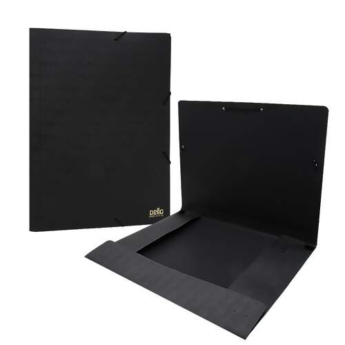 - Possui abas para fixar os documentos no interior da pasta e elástico para fechamento com terminação em plástico
