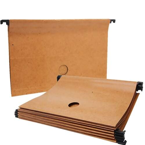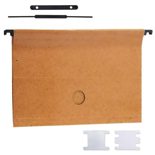 Pasta suspensa em cartão marmorizado (305g/m²). Acompanha visor e etiqueta, grampo plástico e hastes plásticas removíveis.