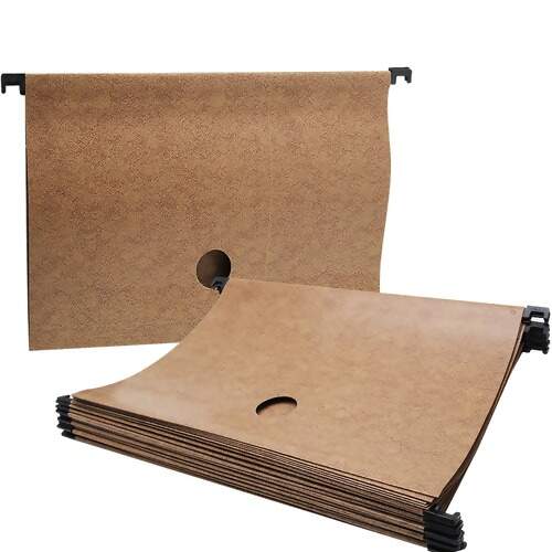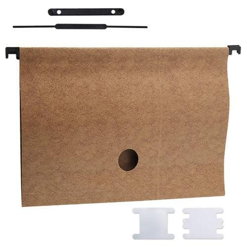 Pasta suspensa em papel kraft pintado (240g/m²). Acompanha visor e etiqueta, grampo plástico e hastes plásticas removíveis.