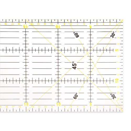 Utilizada para medir tecidos de patchwork, moldes e o que for preciso no seu trabalho. Marcações em centímetros e ângulos que facilitam na hora de cortar os tecidos.