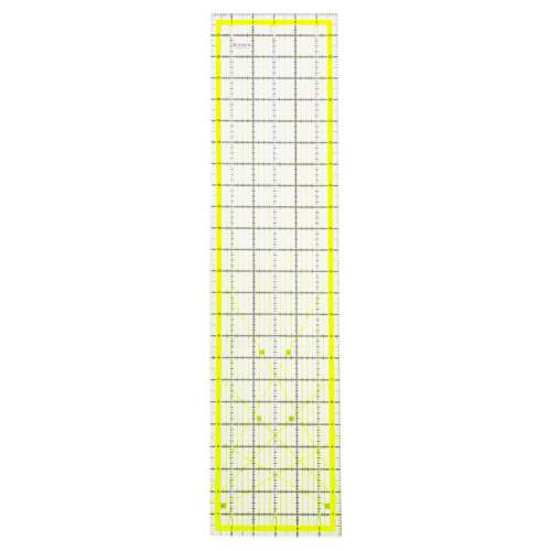 Estas réguas têm uma novidade para tornar o corte mais fácil e seguro: cortar ranhuras! Cada régua possui 3 ranhuras que permitem a passagem de uma lâmina de corte rotativa, garantindo cortes retos e uniformes sem a necessidade de marcar o tecido previamente. Feitas de acrílico resistente e oferecem excelente visibilidade com suas marcações em preto e amarelo.