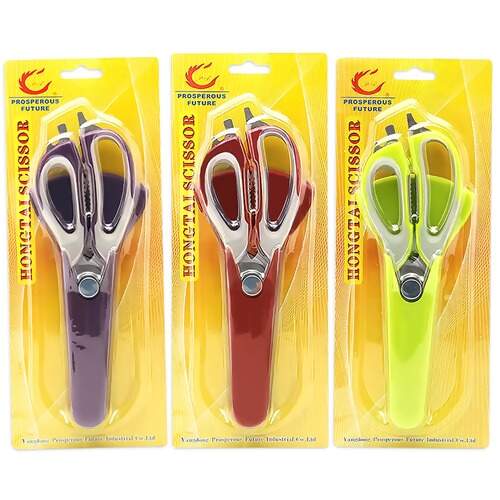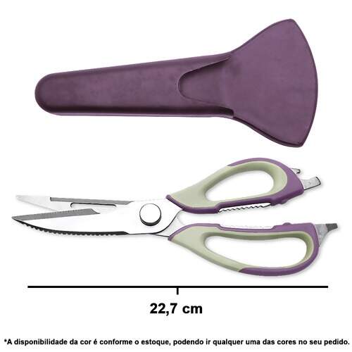 Tesoura Multiuso vem com um suporte com base imantada, ideal para fixar em geladeiras. Possui laminas precisas e cabo emborrachado anatômico. Pode também ser utilizado como quebra nozes, abridor de garrafas e cortar alimentos congelados. Seu material é resistente e antibacteriano proporcionando higiêne no uso. Não necessita afiar.