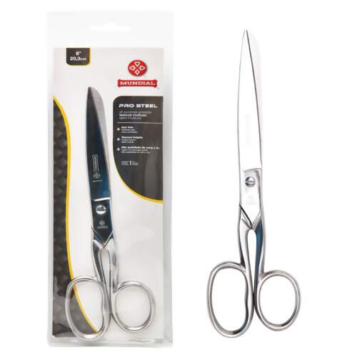 A Tesoura Multiuso Pro Steel Mundial CR3445-8 foi desenvolvida para tornar seu trabalho mais fácil. Com lâminas afiadas de fio liso e argola para três dedos, facilita cortes precisos e rápidos. Indicada para materiais como tecido, plástico, papel, papelão e outras superfícies.
