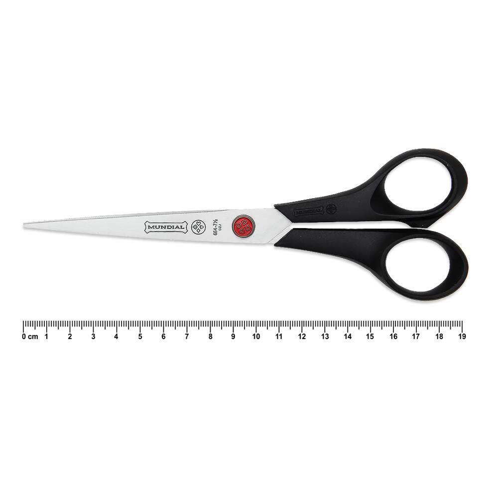 Desenvolvida para cortes em tecido, feltros, linhas, barbantes e etc, muito requisitada pelas costureiras, artesãos e o publico em geral que gostam de alinhar uma tesoura com ótima resistência, durabilidade e corte preciso. Ponta reta e aguda, com lâminas em aço inoxidável e cabo ergonômico desenvolvido em polipropileno preto fosco que evita o deslizamento, possui também um parafuso ajustável protegido pela logo da Mundial: "o ponto vermelho", além de conforto e suavidade em seu manuseio, sendo uma tesoura leve e confortável.