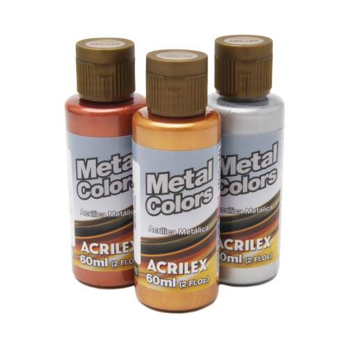 Tinta Metal Colors é para fins decorativos. Ideal para trabalhos de artesanato, indicada para aplicação em madeira, cerâmica, gesso, isopor, couro, cortiça, papel, papelão e PET (preparado antes com Primer Acrilex).