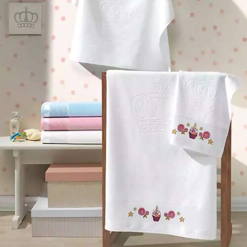 Toalha felpuda para bordar encorpada, com motivos infantis em jacquard. Tendo 60 pontos na altura da barra.