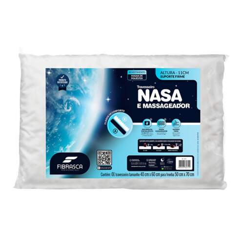 O Travesseiro Nasa Massageador Fibrasca combina duas tecnologias de enchimento para proporcionar mais conforto e qualidade ao seu sono. De um lado, conta com espuma viscoelástica (Nasa) que se adapta ao formato da cabeça; do outro, espuma com gomos massageadores que estimulam o relaxamento. Possui capa em malha de poliéster, que oferece um toque agradável e maciez ao uso.